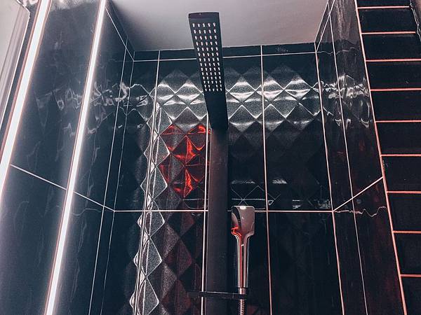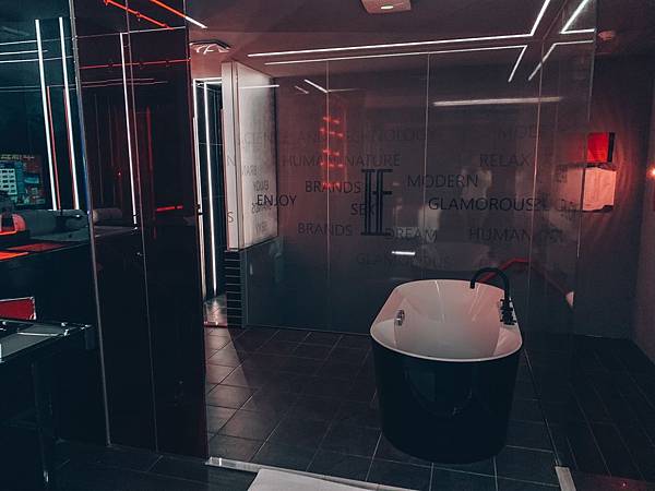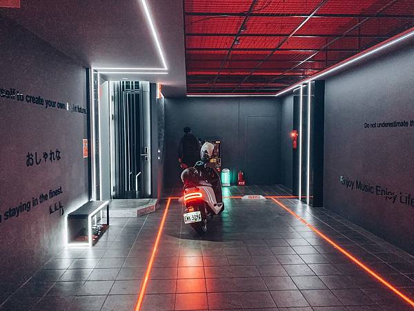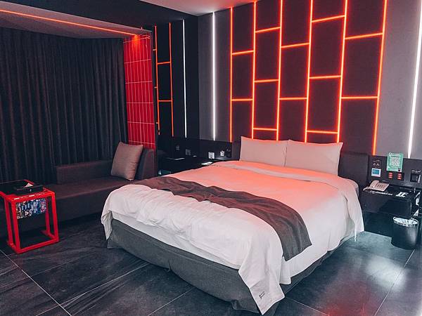 改造成黑色低調風格的LED線條的音樂汽車旅館,非常適合年輕情侶